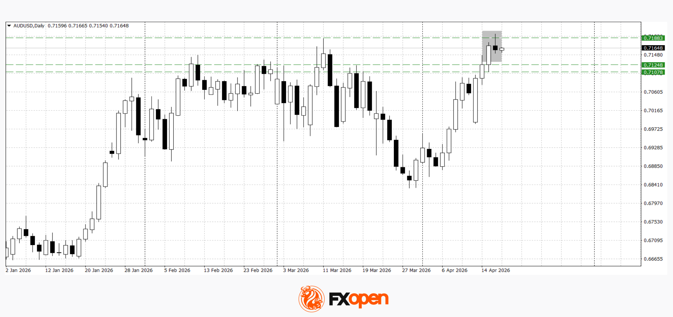 AUD/USD has pulled back after reaching a yearly peak near 0.7180, with a “Bearish Harami” pattern forming on the chart. A negative close in the current session may increase the risk of a deeper decline towards 0.7100–0.7120.