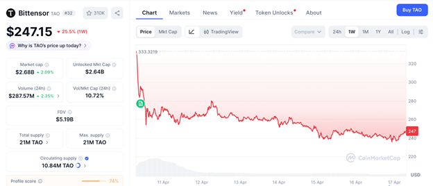 Bittensor trades near $247 on April 17 according to CoinMarketCap after crashing 20% when top subnet developer Covenant AI accused founder Jacob Steeves of centralizing control and sold 37,000 TAO worth $10.2 million.