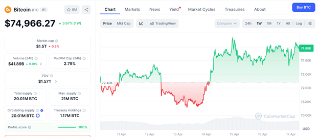Bitcoin trades near $74,966 as of April 16, holding above the $73,495 seven-day moving average after funding rates dropped to their lowest level since 2023, a zone that has matched local market bottoms in past cycles per CoinMarketCap.
