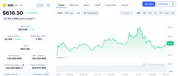 BNB sits at $616 per CoinMarketCap with an $84 billion cap. Price dropped from a March high near $686 and holds above $595 support.
