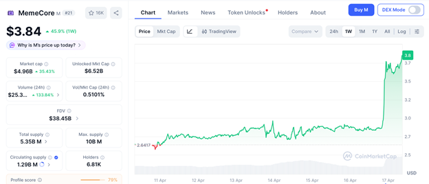 MemeCore is trading near $3.84 after the March 25 hard fork cut gas from 1,500 gwei to 15 and introduced account abstraction according to CoinMarketCap.