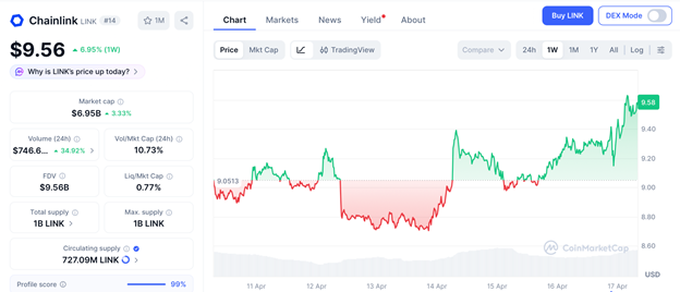 LINK trades near $9.56 after falling roughly 83% from its May 2021 all time high of $52.70 according to CoinMarketCap, continuing to serve as the leading oracle provider across DeFi.
