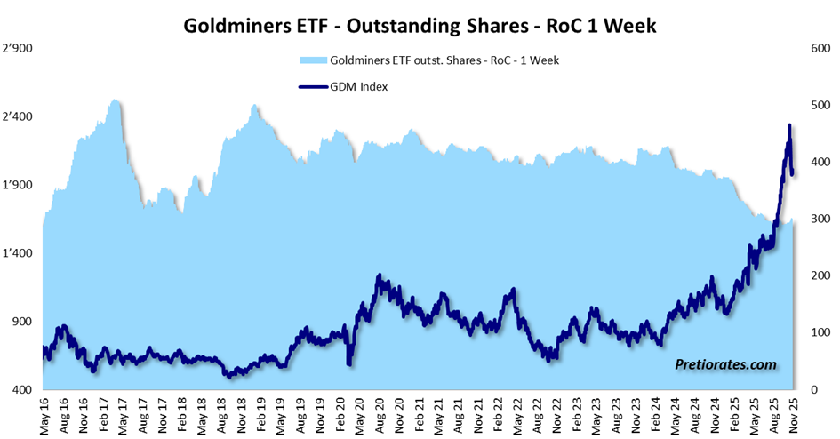 After years of stagnation, the mining industry has recently regained attention. With the rise in Gold and Silver prices, demand for mining stocks picked up. Since its low in spring 2024, the GDM Gold mining index has gained more than 170 percent – a spectacular recovery in less than two years. Nevertheless, the big money flow failed to materialize. The passive investment world, which now controls more than half of global investment volume, has ignored Gold mines. A look at outstanding ETF shares speaks volumes: despite rising prices, they have declined significantly. Apparently, many investors focused on physical metal rather than stocks – and after the sharp rise, many mining stocks are now likely to be considered «too expensive».