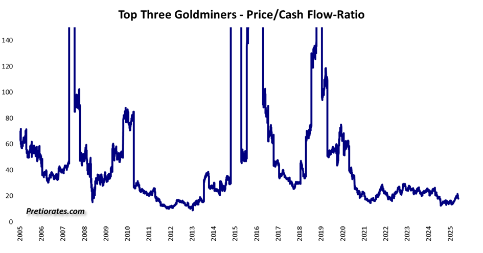 The price-to-cash flow ratio (P/CF) is more meaningful, as it excludes special balance sheet effects and value adjustments. It shows how much investors are willing to pay for a company’s actual cash flow – and thus whether Gold mining stocks are considered expensive or cheap in the market. If the price of Gold falls significantly, margins shrink and the ratio shoots up. Then the stocks appear expensive, even though their prices have usually already fallen noticeably.