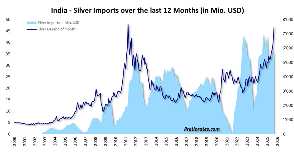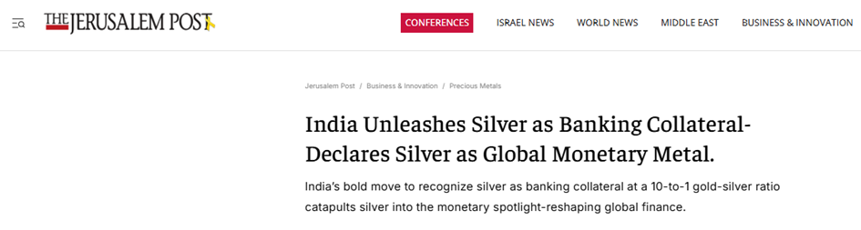 A recent report on the Indian central bank (RBI) caused quite a stir. It allegedly plans to allow Silver as collateral for bank and non-bank loans from April 2026 onwards – with a Silver-Gold ratio of 10 to 1. Silver would once again have the character of money for the RBI, but we find the ratio extremely exciting. Not at 80:1, which is the current ratio between Gold and Silver prices, but at 10. This means that Silver can be used as collateral in the Indian credit system at 10% of the price of Gold. Why should a borrower deposit Gold with the Indian central bank when they only have to deposit 10% of the equivalent value in Silver?