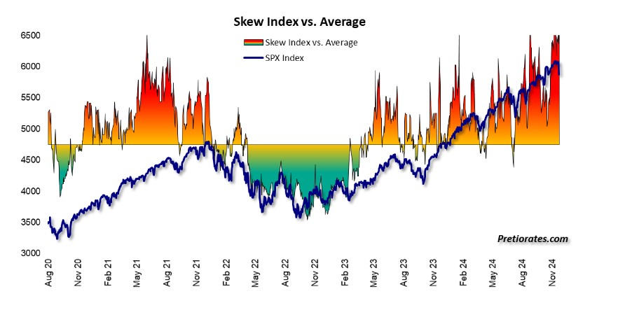 The Skew Index shows how expensive it is to hedge investments (using puts). The bright red area indicates that it has recently been cheaper than almost any time in the last five years. In other words, nobody had an interest in hedging…