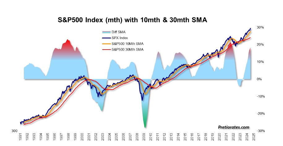 Another (longer-term) indicator: whenever the spread between the 10- and 30-month averages enters the red zone, it is better to be thinking about selling than buying.