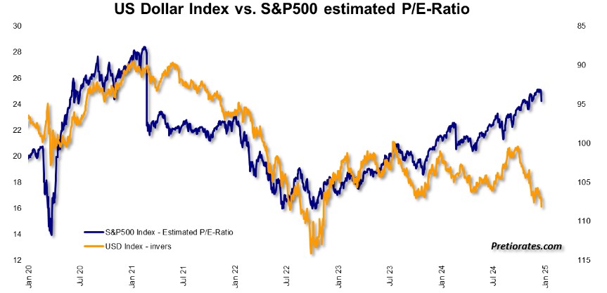 There are also fundamental arguments in favor of the bears. According to the strong US dollar development (shown inversely in the chart), the profit expectations for the S&P500 companies are perhaps too high…