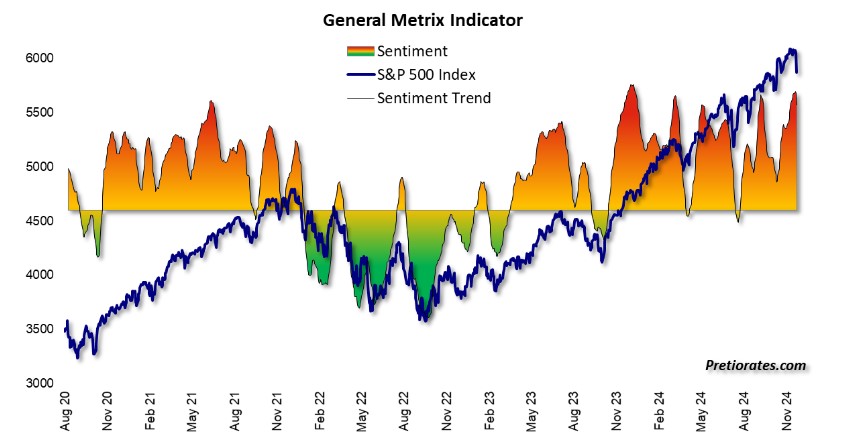 The ‘General Metrix Indicator’, which combines various sentiment indicators, is still at a highly confident level. A long-term low is only to be expected when this indicator falls into the green zone…