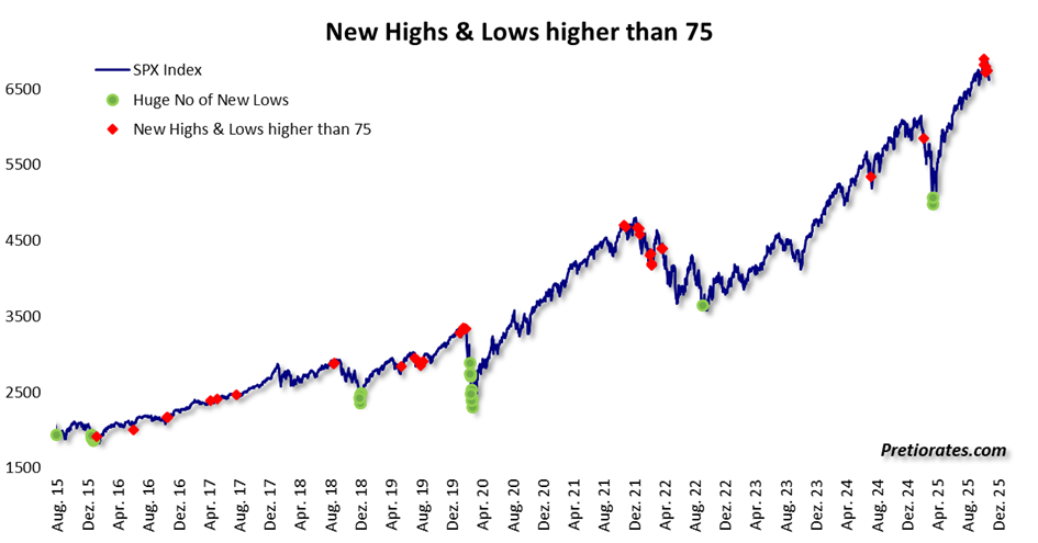 The next chart also provides useful information – not perfect, but valuable in the context of other indicators: when a large number of stocks reach new annual highs, but at the same time just as many stocks reach new annual lows, the overall market appears less convincing. The opposite – the green dots – often indicates hidden strength during periods of weakness. Recently, however, we have seen significantly more red dots.