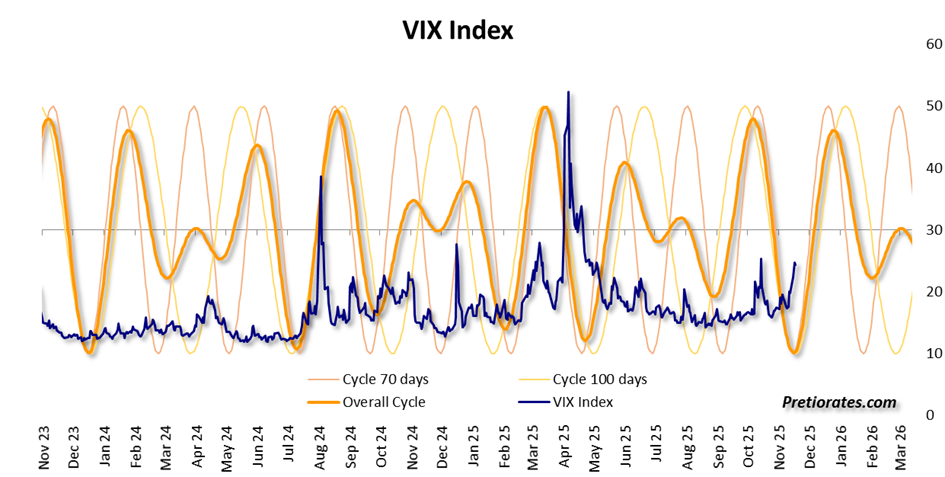 Whether our world is shaped by cycles is a topic that could be debated for days or even longer. We are convinced that it is. But cycles change sometimes; nothing is set in stone. However, the current combination has been working reliably for many years – or decades – if you only look at the major movements. And the cycles of the VIX volatility index are once again pointing to a stronger upturn. More volatility always means more nervousness – and thus usually a correction. However, the current cycle only runs until December 2025…