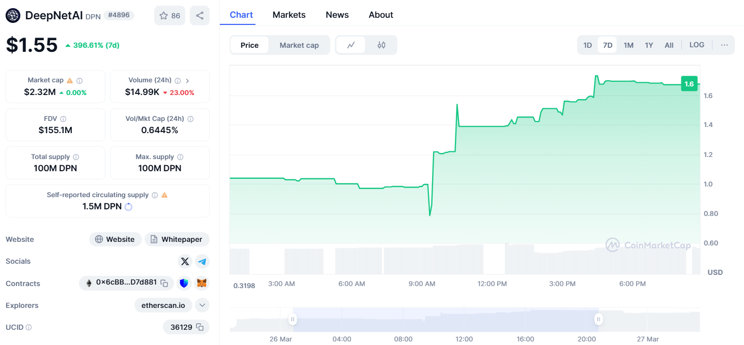 The numbers speak volumes about DeepNet AI’s potential. Trading at $1.55, the project has achieved a 396% growth in 48 hours – a performance that goes far beyond typical market fluctuations.