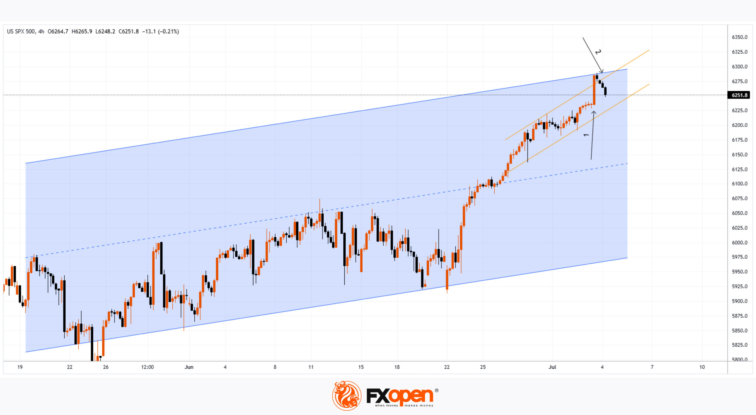 On the 4-hour chart of the S&P 500 (US SPX 500 mini on FXOpen) as of 30 June: