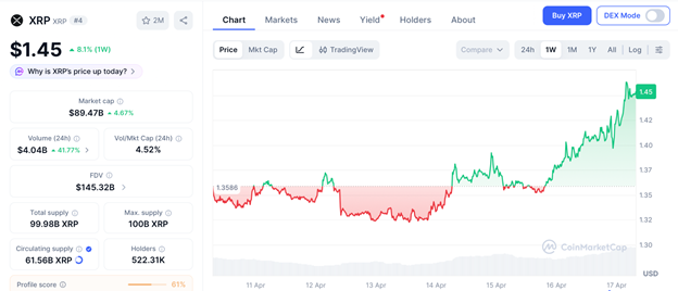 XRP trades near $1.45 after bouncing from $1.30 on heavy volume, according to CoinMarketCap. Whale buying is rising, but XRP remains 62% below its $3.65 all time high with the 200 day EMA at $1.88 overhead.